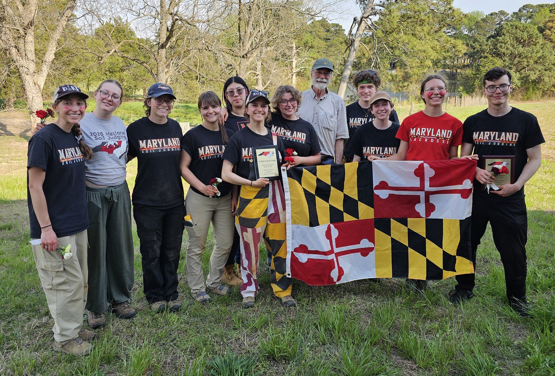 University of Maryland Soil Judging Team at the 2026 National Competition in Raleigh, NC. L to R: Kelsey Genovese, Helen McConville, Emily O’Neill, Sage Greiner, Crystal Kitburi, Ellie Rogers, Tyler Demory, Martin Rabenhorst (Coach) Spencer Goldberg, Zie Goodman (7th place), Anya Olson, Cole Chapman (3rd place).